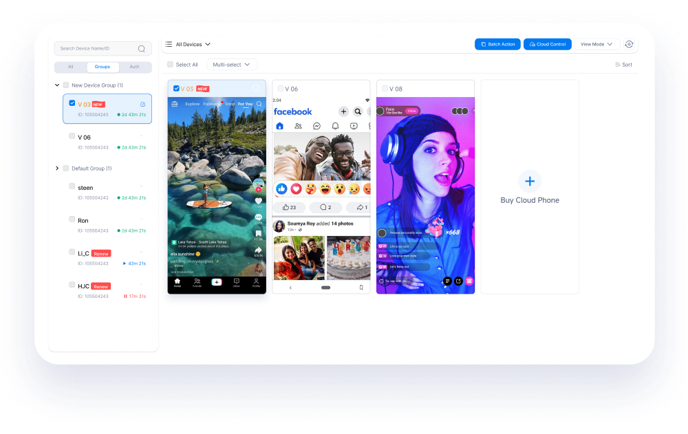 Run mobile apps like TikTok, Instagram, or Reddit in multiple virtual Android profiles, each scrolling in a separate cloud phone to stay undetected.