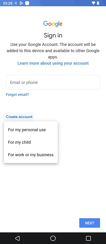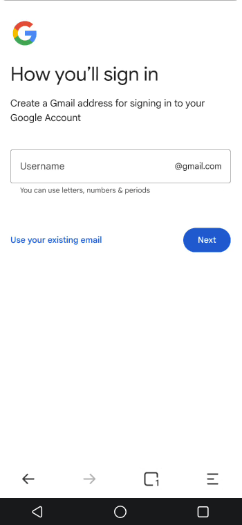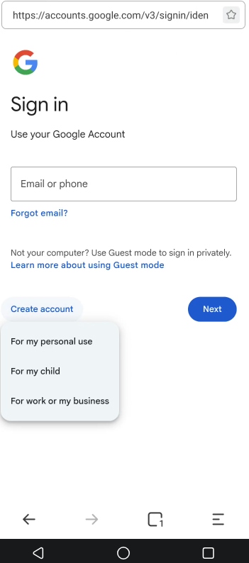 Launch Google app to add an account or find Google in “Settings” , click Sign in then tap create account for a new one. You can also go to the Google account sign-up page and click “Create account”. A common registration path starts with choosing to create an account “For my personal use.”
