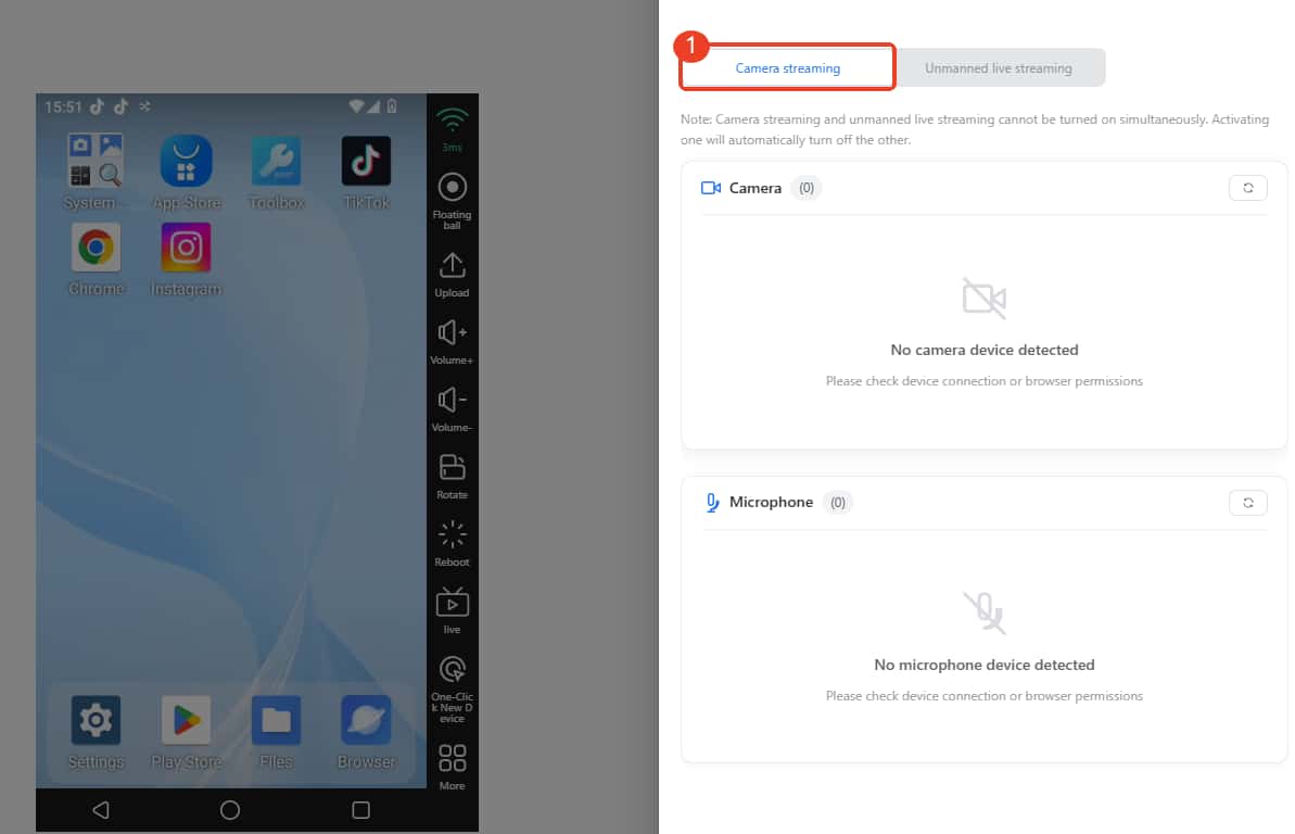 Step 2. If you want to have a real-time live stream, then select ->the Camera Streaming to start with (first pic shows the situation that didn’t detect the microphone and camera). Kindly note this kind of streaming requires accessing your Camera device and Microphone device, please make sure you allow these settings on the pop-up windows as follows (pic 2).