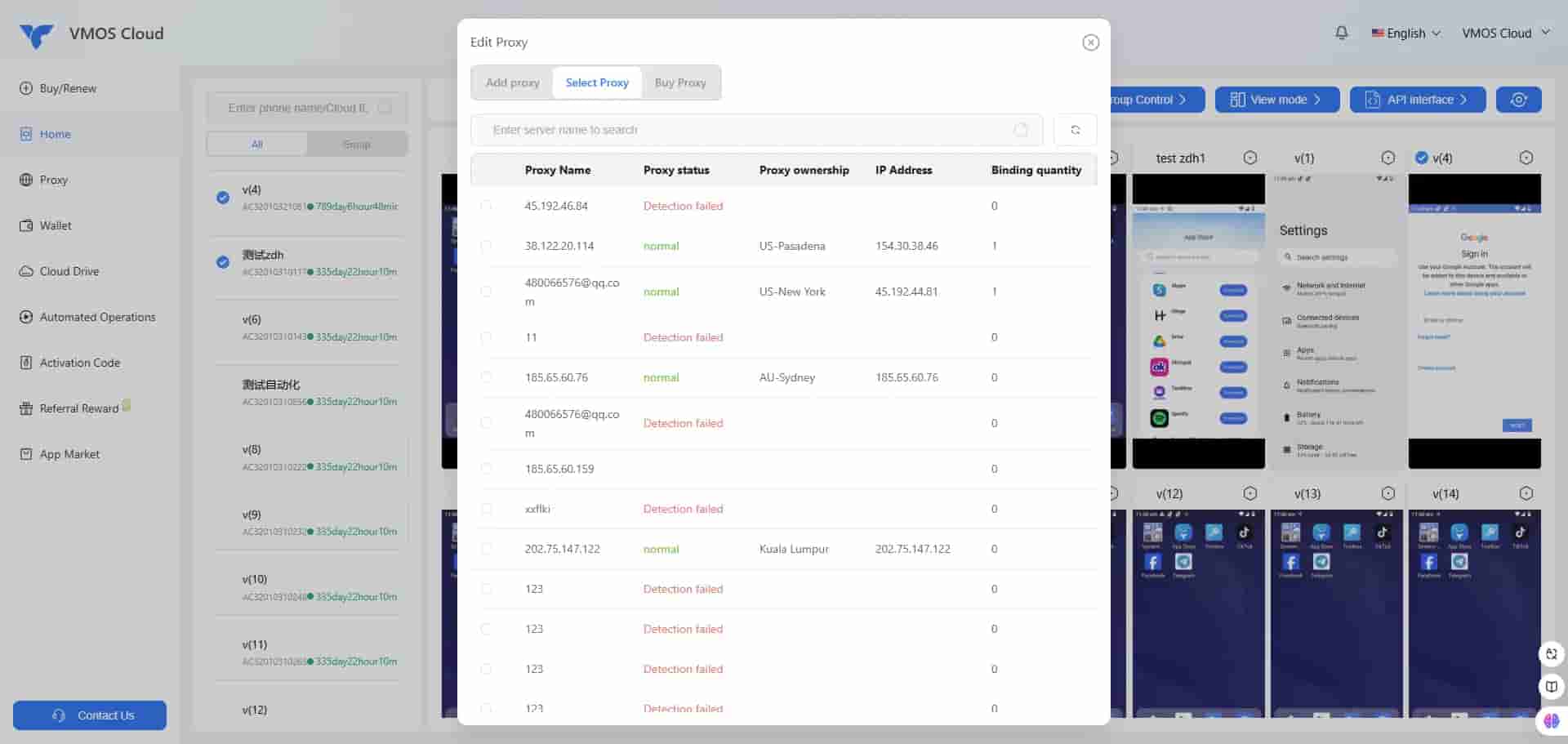 Редактировать функцию облачного телефона: нажмите, чтобы выполнить такие действия, как изменение настроек прокси-сервера, группировка устройств и отмена привязки прокси-серверов.