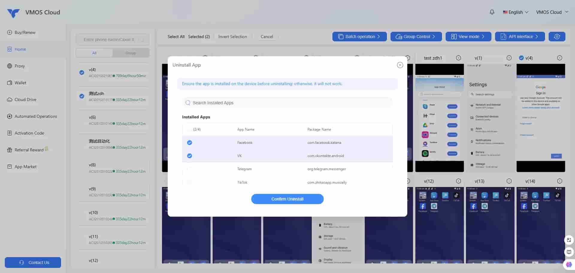 1.Пакетная активация: После загрузки файлов на облачный диск и установки их на облачный телефон, вы можете нажать, чтобы активировать выбранные облачные телефоны пакетами. Приложения на выбранных облачных телефонах затем будут запускаться автоматически.